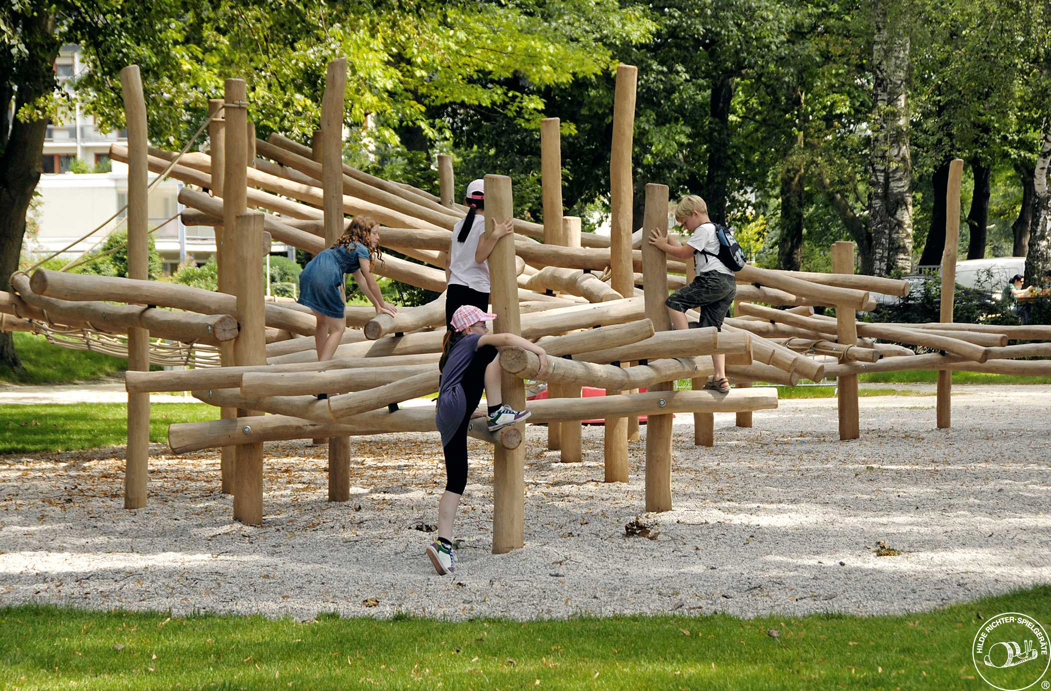 Climbing Structures made from hand-processed irregular round logs, can be integrated into a strongly nature-oriented environment due to their formal expressive character. Many children can play within a small space; Climbing Structures can even absorb the arrival of a large number of children who wish to play on it and incorporates all of them within a flowing play rhythm. Climbing Structures do not only allow for climbing, experiencing height and for having a sensual experience with hands and feet, but they can also be used as a nice seat for relaxing and observing.Recommended For