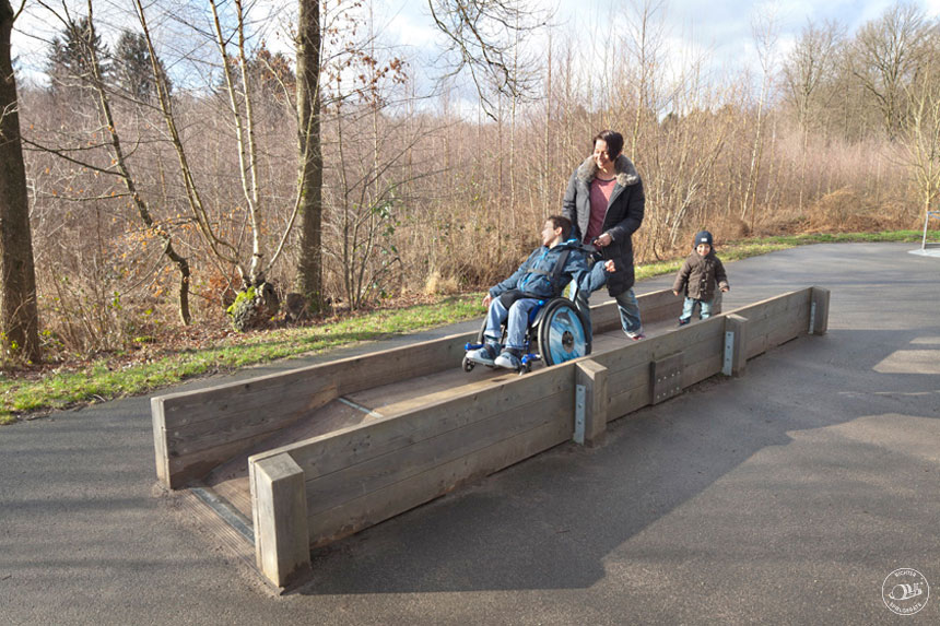 A three-part see-saw plate is mounted on joints in a protective frame. The see-saw motion is generated by rolling to and fro or through corresponding body movement while walking. Mutual action, the stimulation of playing together and having to cooperate are the valuable elements of this equipment. Here, wheelchair users and the able-bodied, big people and little ones, heavy and light as well as old and young can all play together. Playing on it gives the impression of physically moving a part of the path or ground.