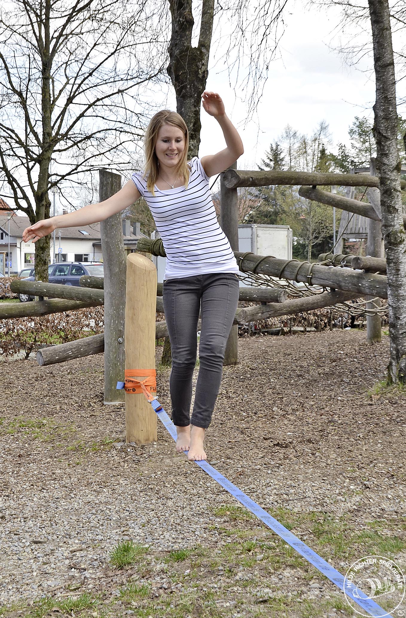 A new level of exercise is created by simply stretching a line. Leaving the normally solid ground beneath you, suddenly poses completely new challenges. The continuous forwards movement makes first mastering the capricious system a must. Playing companions or an accompanying person can offer a fixed point for the tightrope walker at the beginning to help them conquer the balancing act. The continuously evasive line pushes the user towards increasingly successful methods to triumph over the unsteadiness in free space. It quickly becomes clear that continuous balancing movements and control over the body's centre of gravity are the decisive skills needed to accomplish forwards movement. Progressive exercises with backwards walking, knee stands or an inclined line remain an option for the practised user.Recommended For